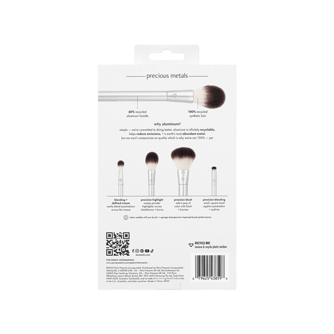 EcoTools Precious Metals — коллекция экологичных инструментов для макияжа, вдохновленная красотой и уникальностью природных металлов. Все кисти коллекции изготовлены из переработанного синтетического ворса, а ручки кистей на 60% состоят из вторичного алюминия.